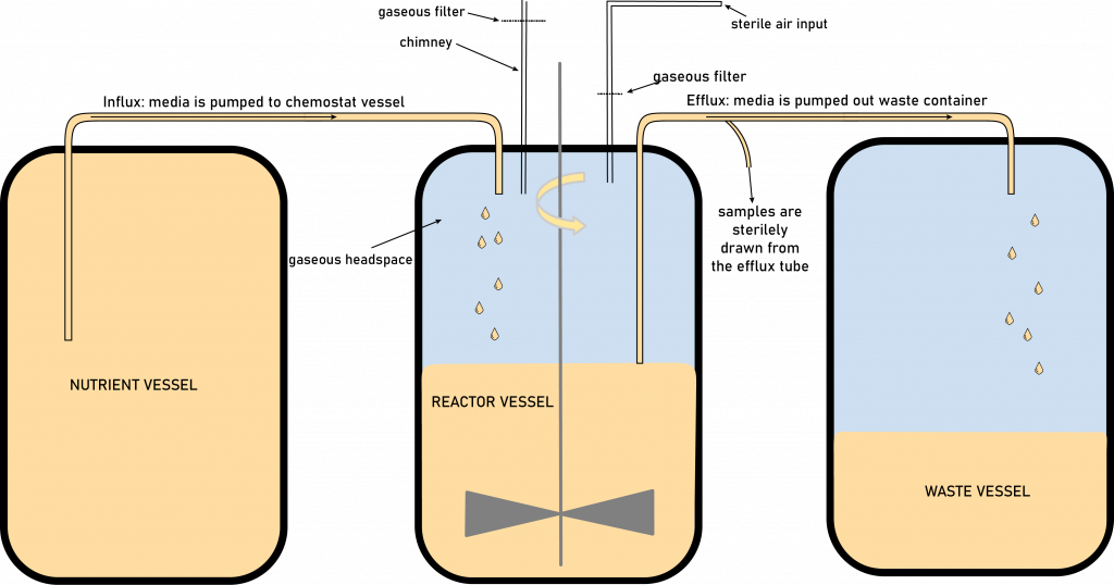 With the use of experimental evolution in chemostats, the research team will evolve all possible pairs of three facultatively anaerobic bacterial species across an oxygen gradient of anoxic, dysoxic, fluctuating anoxia and dysoxia, and oxic conditions.